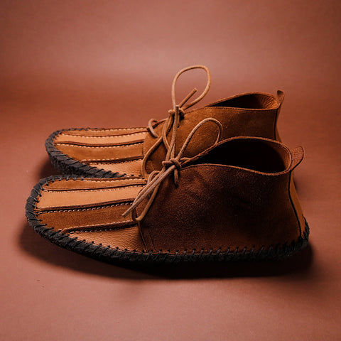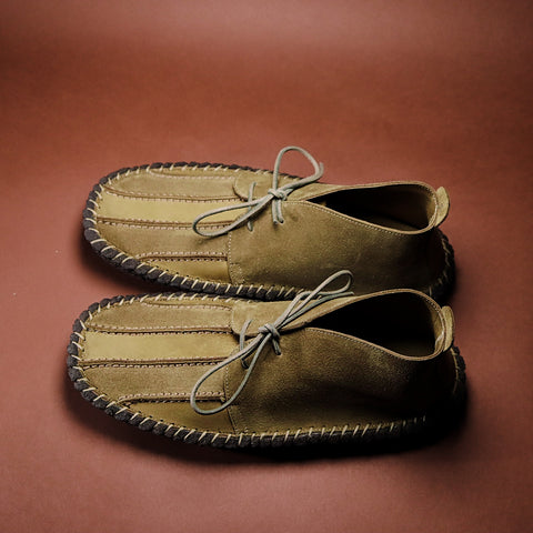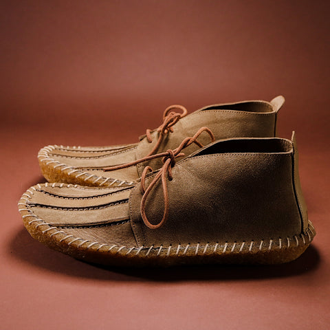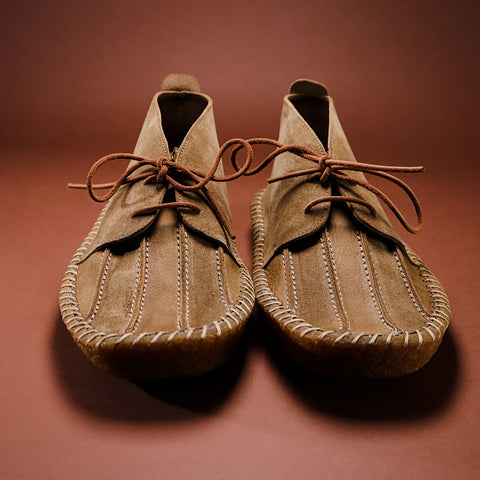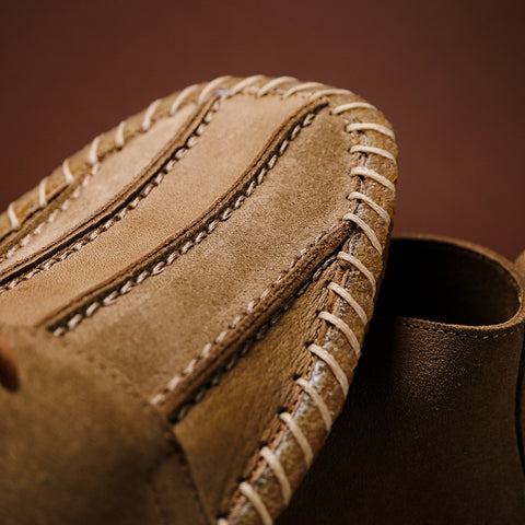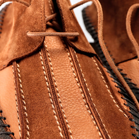 Gallowfield stands out as one of our most striking shoes. Inspired by our original Risedale model, Gallowfield incorporates all its great features—including luxurious Italian reverse suede, a meticulously hand-stitched solid crepe sole, and a highly supportive removable footbed covered in suede—while adding an elegantly hand-crafted vamp (the front of the boot). The Italian Castoro reverse suede has been utilised to its fullest, showcasing both the suede and leather sides of the material within a single panel. This approach results in a subtle stripe effect on the front of the otherwise refined and minimal chukka, generated by the variance in shading between the suede and leather surfaces of the same 2.2mm thick skin.