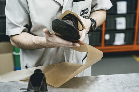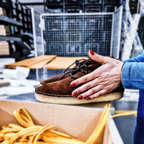 We understand that the first encounter with our shoes begins with the packaging. We want this moment to be special. Before they reach your hands, each pair of Meanforme shoes undergoes a thorough examination, and level of what we call like to call fettling. Our factory finishers lightly brush the uppers and gently stuff the shoes to preserve their shape during transit. We wrap our shoes in three layers of a 55gsm waxed kraft paper. This protective cocoon shields the uppers from any possible marking and ensures that the natural crepe soles remain separate. Every pair finds its home sat in our branded Kraft FSC recycled/recyclable mail order shoe box.