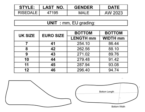 Each pair of Meanforme are handmade and handsewn, as such no two pairs will be identical but one constant is the last used to make them. Risedale has been engineered using our dedicated last 47195, the measurements for this last are the following: